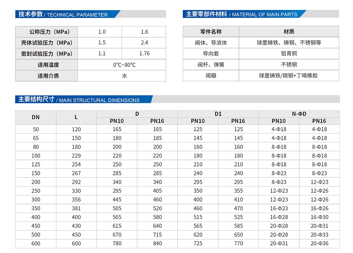 HC42X靜音式止回閥由閥體、閥座、導(dǎo)流體、閥瓣、軸瓦及彈簧等零件組成。內(nèi)部流道采用流線型設(shè)計(jì),壓力損失小,閥瓣啟閉行程很短,停泵時可快速關(guān)閉,防止巨大的水錘聲,形成靜音效果。該閥主要用于給水、排水、消防、暖通系統(tǒng),可安裝于水泵出口處,能夠防止介質(zhì)倒流,達(dá)到保護(hù)水泵及管道目的。